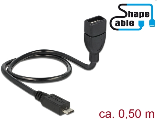 This cable by Delock can be used to connectUSBdevices, such as memorysticks,to theMicroUSBport on a mobile device.An integratedwireinthe ShapeCablecan be bentinto any form andretains its shape. This can be usedto position the OTG device in an optimal location.