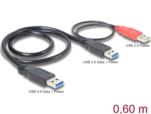 This USB 3.0 Y-cable by Delock enables you to connect a USB 3.0 device, e.g. an external 2.5 HDD enclosure, hub or card reader, to your notebook or PC. The red USB plug provides additional power, an external power supply is not needed even when using devices with a high power consumption. The high cable gauges of the power and data lines ensure a safe connection between your device and the system.