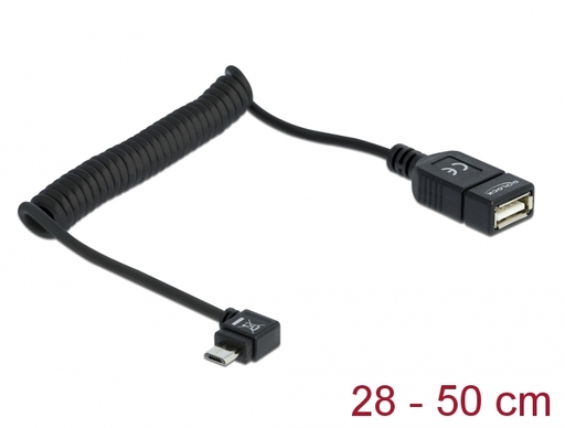 This angled USB micro cable by Delock enables you to convert the USB micro-B port of your mobile device into a USB-A female port. Thus you can connect e.g. HDDs or memory sticks with standard USB port to mobile phones, smart phones, tablet PCs etc. with OTG support. The OTG function enables a direct data transfer between your mobile device and the USB device, without connection to a computer. Due to the coiled cable it can be stored easily and does not take too much space compared to common cables.