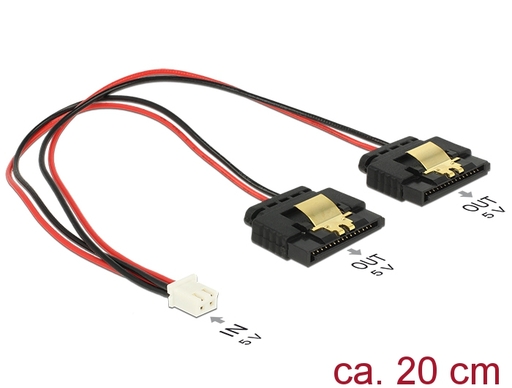 This cable by Delock enables the power supply of two devices equipped with a SATA 15 pin receptacle over one free 2 pin power connector on the motherboard, as available e.g. on the Banana Pi. The metal clips on the SATA receptacles ensure that the cable reliably clicks into place.
