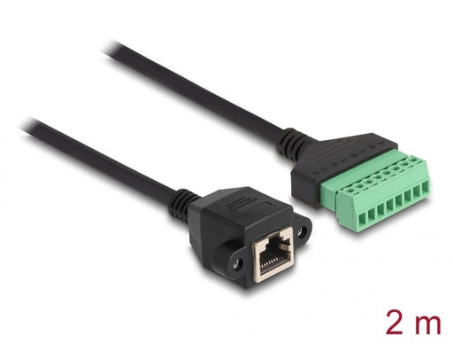 This cable by Delock can be used to extend and connect various network devices. Strands with stripped ends can be connected via the terminal block. The screwable RJ45 jack can be attached, for e.g., to a slot bracket or a housing with a suitable cut-out.