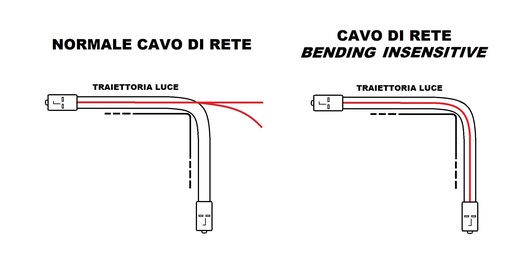 CAVI FIBRA OTTICA PER APPLICAZIONI AD ALTA DENSITAÆ Normalmente un cavo fibra ottica quando si posiziona Þ sottoposto a piegamenti e curve. Tutti i cavi supportano fino a un certo grado di curvatura (Bending Radius), ma soprattutto dentro gli armadi rack capita spesso che per ragioni di spazio si debbano piegare i cavi oltre questo limite, e i normali cavi fibra ottica sono molto sensibili ai piegamenti. Quando si piega un cavo in fibra, la luce nella parte esterna del nucleo non viene pi¨ riflessa verso il centro del nucleo ma si perde nella guaina causando una significativa perdita del segnale. I cavi Bending Insensitive (anche bend insensitive fiber (BIF), bend improved, bend optimized o bend tolerant) sono progettati per continuare a trasmettere con perdite minime anche se sottoposti a piegamento grazie a uno strato aggiuntivo di materiale riflettente intorno al nucleo, che impedisce alla luce di disperdersi nella guaina. Cavi ottici con guaina Halogenfree LSZH classe OM4. Per collegare tra loro dispositivi con connettori in fibra ottica. Le specifiche di questo cavo OM4 permettono il trasferimento dati fino alla velocitÓ di 100 Gigabit Ethernet. Confezionati singolarmente. Connettore 1: LC/UPC Connettore 2: SC/UPC Classe fibra: OM4 Tipo: Multimodale Colore cavo: viola Diametro della fibra: 50/125 micron