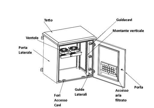 Armadio rack da esterno Classe di Protezione IP55, protetto contro la polvere e i getti dĘacqua.Anche per ambienti molto polverosi, dove sia necessario preservare i dispositivi interni.Grazie alla costruzione in SGCC (acciaio galvanizzato) al posto del normale acciaio dei comuni armadi rack, pu= resistere anche in ambienti salini o umidi.Fianchi laterali e porta posteriore chiusa tramite saldature, per minimizzare lĘingresso di polvere e acqua.Gli altri accessi sono protetti con guarnizioni di plastica, (la porta anteriore e lĘaccesso dei cavi) o da filtri (lĘingresso aria dalla porta centrale e lĘuscita aria spinta dalle ventole sul tetto).In questo modo si ha una massima protezione dei dispositivi interni e si pu= assicurare unĘefficiente aerazione.Incluse le staffe per installazione a muro.Con incluso un kit da 2 ventole filtrate installate sul tetto, con interruttore.Con 4 montanti per installazione di dispositivi anche sul retro, e guidacavi laterali sui montanti anteriori.I montanti si possono regolare in profonditÓ cosż da permettere flessibilitÓ nel tipo di dispositivi da installare.Sono inclusi i tasselli per lĘinstallazione a muro e le viti per installazione dei dispositivi interni.Entrata cavi dal fondo tramite 4 fori con tappi di gomma.Chiusura porta con guarnizioni di plastica per la tenuta stagna.Tetto a pagoda per la protezione dalla pioggia, e per permettere lĘuscita dellĘaria dal tetto.Ventole senza termostato.Colore grigio chiaro RAL7035 Porta con chiusura a chiave triangolare e fessure aerazione filtrate.Cavo di messa a terra incluso.Apertura porta 90¦