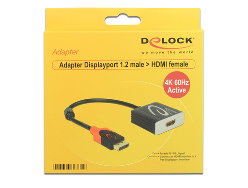 This adapter by Delock enables the connection of an HDMI monitor to the system via a free DisplayPort interface. The adapter supports a resolution up to 4K Ultra HD at 60 Hz and is backward compatible to Full-HD 1080p. The adapter offers an active conversion, thus it is also suitable for graphics cards that are not capable of outputting DP++ signals.