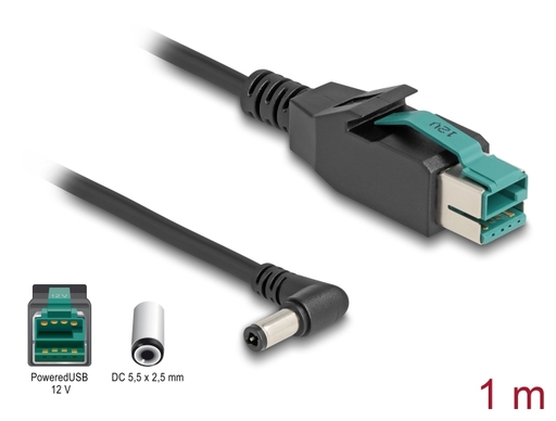 This PoweredUSB cable by Delock can be used to supply power to a device with DC 5.5 x 2.1 mm female port via a PC or hub with PoweredUSB 12 V port.