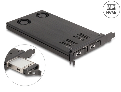 This mobile rack by Delock can be installed into a PC slot of the computer and provides two M.2 slots in 2280, 2260, 2242 or 2230 format.