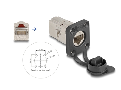 This RJ45 built-in conenctor with D-shaped metal flange by Delock can be used for panel mounting and for installation in a housing.