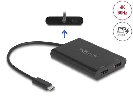 The adapter by Delock enables the connection of additional HDMI monitors, projectors, etc. to a PC or laptop via USB-C connector. Ultra-HD (4K) resolution is possible when using only one monitor and also when using both HDMI outputs at the same time. There is no DisplayPort Alternate Mode support required.