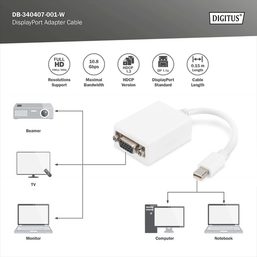 DIGITUS Cavo Adattatore Mini DP 0,15 Mt. Colore Bianco   (Carta di Credito Web ) 15,72 € + IVA Aggiungi Prodotto al Carrello