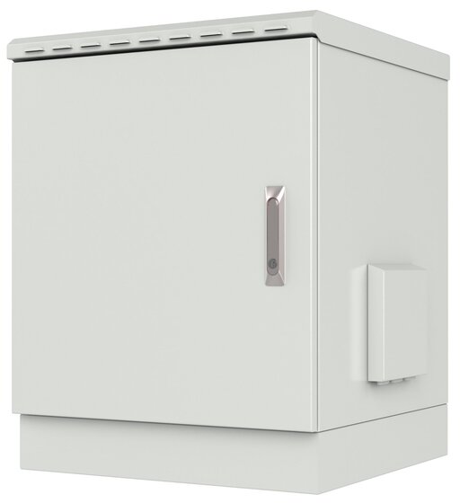 Armadio rack 19 a pavimento da 20U con porta cieca singola in lamiera, indicato per installazione in condizioni estreme (ambienti polverosi, nebbie saline..): grazie alle guarnizioni poste sul tetto e sulla porta permette di proteggere le apparecchiature installate internamente da polvere e acqua