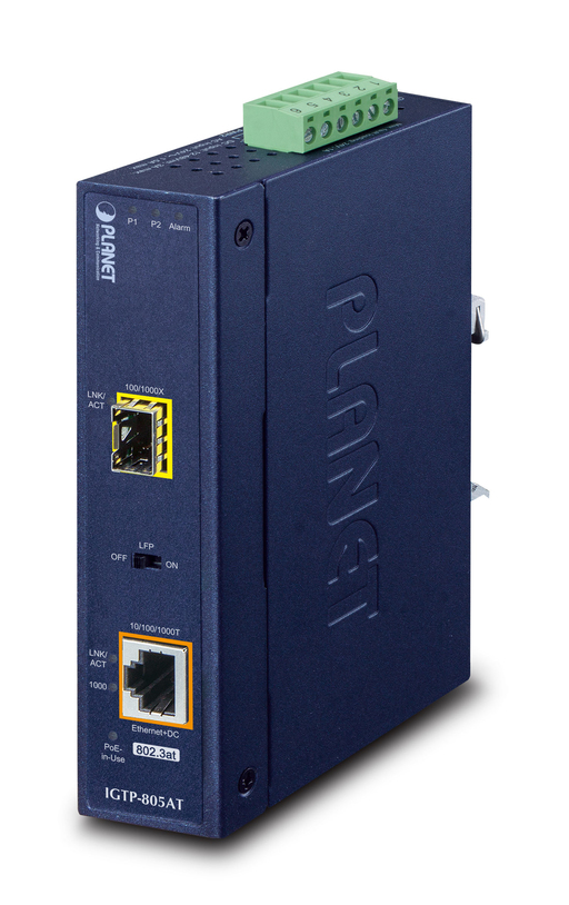 PLANET IGTP-80xT Industrial Gigabit Media Converter combines Ethernet media conversion (from 1000BASE-X to 10/100/1000BASE-T) with 802.3at Power over Ethernet Plus (PoE+) injector to deliver both up to 30 watts of power output and high data transmission speed to PDs (powered devices) installed in a remote area where sufficient and reliable power input is required. Its 1000BASE-X fiber optic uplink port provides long distance, high speed and stable data transmission to a remote core network. The special and convenient power system of the IGTP-80xT supports 12~48V DC power input or 24V AC power input for power redundancy and operational flexibility. Being able to operate under the temperature ranging from -40 to 75 degrees C and with an IP30 rugged case, the IGTP-80xT can be placed in almost any difficult environment. Fiber-optic Link Capability Extends the Range of Network Deployment The maximum distance between a PoE PSE (power sourcing equipment) and PD via Ethernet cable is 100 meters. To extend the PoE deployment range, the IGTP-80xT is integrated with fiber interface for farther distance applications. The IGTP-80xT’s fiber connector type is as follows: - IGTP-802T Fiber SC connector supporting 1000BASE-SX multi-mode and transmission distance up to 550m. - IGTP-802TS Fiber SC connector supporting 1000BASE-LX single-mode and transmission distance up to 20km. - IGTP-805AT SFP slot supporting 100BASE-FX/1000BASE-X multi/single mode SFP module and transmission distance up to 120km (Varying on SFP module). With the long fiber distance support, the IGTP-80xT still sustains the transmission performance as high as 1000Mbps. It works in the high-performance Store and Forward mechanism, and also can prevent packet loss with IEEE 802.3x flow control and the LFP (Link Fault Passthrough) function in the DIP switch design. Furthermore, it can immediately alert the administrators of the broken link and provide efficient solution to monitor the network power usage. Plug and Play High Power Sourcing Solution Complying with the IEEE 802.3at Power over Ethernet Plus technology, the IGTP-80xT provides up to 30 watts of PoE output power, doubling that of the earlier 802.3af. It is also backward compatible with 802.3af PoE standards to allow users to flexibly deploy standard and high powered devices simultaneously with no need of software configuration. With data and Power over Ethernet from one unit, the IGTP-80xT can reduce cable deployment and eliminate the need for dedicated electrical outlets on the wall, ceiling or any unreachable place. Convenient and Reliable Power System To facilitate the 802.3at power PoE+ usage with the commonly-used 12~48V DC power input or 24V AC power input for transportation and industrial-level applications, the IGTP-80xT adopts the 12~48V DC to 52V power boost technology to solve power source issue but does not require special power supplies. Its wide-ranging voltages design is suitable for worldwide operability with high availability applications requiring dual or backup power inputs. Environmentally Hardened Design for Industrial PoE Networks The IGTP-80xT is specifically designed with durable components and strong housing case to operate reliably in electrically harsh and climatically demanding environments like plant floors or curbside traffic control cabinets. The IGTP-80xT is packaged in a compact, IP30 rugged case that allows either DIN-rail or wall mounting to have the efficient use of cabinet space. With IP30 rugged case protection and PoE design, the IGTP-80xT is ideal for service providers, campuses and public areas to deploy PoE wireless access points, IP cameras or IP phones in any places easily and efficiently with cost-effectiveness. It can also operate in wide temperature range of -40 to 75 degrees C, so it can be placed in almost any location.