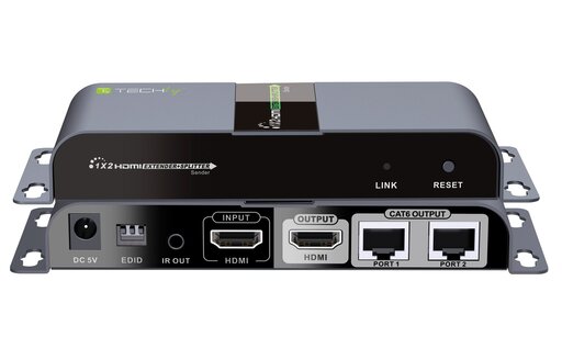- Distribuisce il segnale audio/video proveniente da una sorgente HDMI a 2 schermi HDMI contemporaneamente utilizzando un cavo di rete Cat.6 o superiore