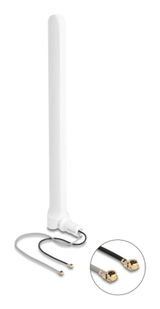 This twin antenna by Delock has two physically separated transmitting and receiving units for WiFi 6 2.4 GHz and 5 GHz. It can be connected to a device with I-PEX Inc., MHF- I interface, in order to send and receive signals indoors.