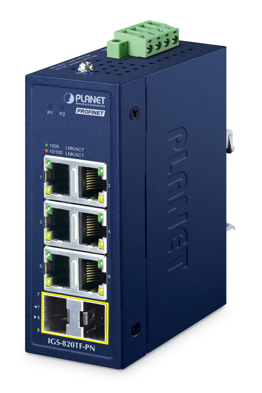 PLANET IGS-820TF-PN Compact Industrial 6-Port 10/100/1000T and 2-Port 1000X SFP PROFINET Switch is designed for industrial use, featuring 6 auto-negotiation 10/100/1000BASE-T RJ45 ports and 2 1000BASE-X SFP interfaces. It supports back-ward compatibility with 100BASE-FX transceivers, is housed in an IP30-rated rugged but compact case, and is equipped with a wide-ranging redundant power system (9~48V DC or 24V AC). The IGS-820TF-PN is capable of operating in harsh environ-ments with a temperature range from -40 to 75 degrees C. As the trend for an IIoT (Industrial Internet of Things) infrastructure continues to grow, the IGS-820TF-PN simplifies industrial network deployment with its Plug and Play feature. Beyond offering stable and reliable fast data and power transmission, it aligns with the AIoT (Artificial Intelligence of Things) vision by enabling seamless in-tegration of intelligent systems. This integration facilitates real-time decision-making, operational efficiency, and valuable data analysis across various industrial applica-tions.