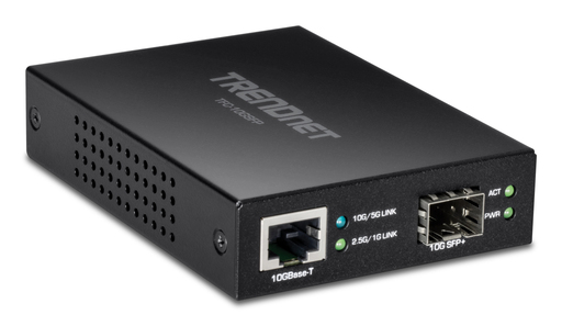 TRENDnet’s compact 10GBASE-T to SFP Fiber Media Converter, model TFC-10GSFP, converts a 10GBASE-T (Copper 10Gbps) ethernet connection to 10G BASE-SX/LX (Fiber) SFP media connection , and vice versa. The 10GBASE-T RJ-45 port on the 10G SFP+ transceiver supports a full-duplex 10G connection at wire speed. The SFP slot supports both multimode (SX) or single-mode (LX) SFP modules.
