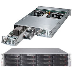 SuperServer, 2U Rackmount, Dual socket R3 (LGa 2011), 16x DIMM sockets, 6x 3.5" Hot-swap drive bays, AMI BIOS SYS-6028TP-DNCR / SYS-6028TP-DNCTR / SYS-6028TP-DNCFR 2x DP nodes in 2U; depth 30.5", Each Node (x2 nodes): Dual Socket R3 (LGa 2011) support: Intel Xeon processor E5-2600 v4/v3 family 16x DIMM slots; up to 2TB ECC 3DS LRDIMM or RDIMM DDR4-2400MHz 1x PCI-E 3.0 x16 and 1x PCI-E x8 slots 6x 3.5" Hot-swap drive bays (up to 4x NVMe + 2x SAS3 or 6x SAS3) 1x InfiniBand port (FDR, 56Gbps), w/ QSFP connector ("FR" SKUs) I/O ports: 2x GbE/10GBase-T ("TR"), 1x Video, 2x USB 3.0 Titanium Level System management: Built-in Server management tool (IPMI 2.0, KVM/media over LAN) with dedicated LAN port 4x 80mm heavy duty fans w/ optimal fan speed control 1600W Redundant Titanium Level (96%) High-efficiency Digital Power Supplies