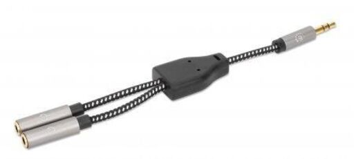 Un connettore maschio e due connettori femmina stereo ausiliari da 3.5 mm per splittare un singolo jack audio presente su una sorgente multimediale in due jack cuffie