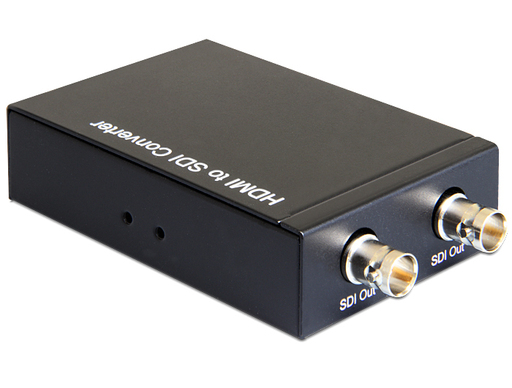 This converter by Delock can be used to convert an HDMI signal to an HD- or 3G-SDI signal. Different video devices can be connected, e.g. a camera with HDMI output to an HD-SDI recorder. The SDI signal is transmitted via a conventional 75 Ohm coaxial cable with BNC connectors.
