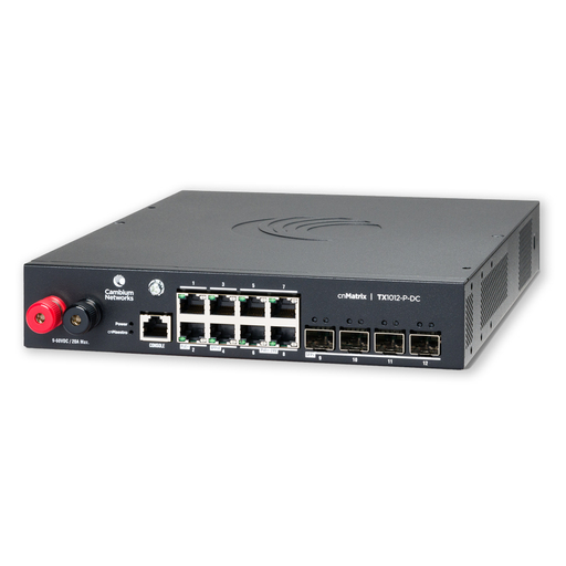Cambium Networks cnMatrix Switch TX1012-P-DC. Tipo interruttore: Gestito, Livello del commutatore: L2/L3. Tipo di porte RJ-45: Gigabit Ethernet (10/100/1000), Quantit+á di porte RJ-45: 8, Console port: RS-232. Dimensioni tavola MAC: 16000 voci, Capacit+á di commutazione: 1000 Gbit/s. Voltaggio input DC: 24 - 56 V. Connettore di alimentazione: Jack DC-ingresso. Supporto Power over Ethernet (PoE). Montaggio rack