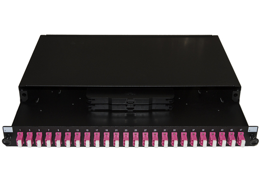 Box di giunzione per fibra ottica, occupa 1 unitÓ nellĘarmadio rack. Pannello estraibile per fibra ottica in acciaio con 24 adattatori per fibra ottica LC Duplex OM4 giÓ instalati- LĘinterno Ž giÓ equipaggiato per lĘinstallazione dei pigtail, con cassette di giunzione, splice box, guidacavi, tubetti. Con 4 asole passacavi aperte per veloce rimozione del pressacavo ed agevole estrazione del vassoio. Ampio ingresso posteriore con premarcato removibile per eventuale giunto di spillamento. Colore nero RAL9005. Pigtail non inclusi. Il cassetto pu= essere estratto e inclinato verso il basso, agevolando la lavorazione. Installabile su armadio rack 19" grazie alle staffe 19" incluse, regolabili per variare la profonditÓ a cui mettere il cassetto. Conforme agli standard sul cablaggio in fibra ottica. Compatibile con OM2 e OM3 Colore nero.