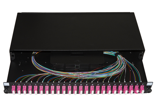 Box di giunzione per fibra ottica, occupa 1 unitÓ nellĘarmadio rack. Pannello estraibile per fibra ottica in acciaio con 24 adattatori per fibra ottica LC Duplex OM4 e pigtail installati. LĘinterno Ž giÓ equipaggiato coi pigtail, con cassette di giunzione, splice box, guidacavi, tubetti. Con 4 asole passacavi aperte per veloce rimozione del pressacavo ed agevole estrazione del vassoio. Ampio ingresso posteriore con premarcato removibile per eventuale giunto di spillamento. Pigtail inclusi. Il cassetto pu= essere estratto e inclinato verso il basso, agevolando la lavorazione. Installabile su armadio rack 19" grazie alle staffe 19" incluse, regolabili per variare la profonditÓ a cui mettere il cassetto. Conforme agli standard sul cablaggio in fibra ottica. Compatibile con OM2 e OM3 Colore nero RAL9005..