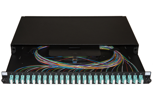 Box di giunzione per fibra ottica, occupa 1 unitÓ nellĘarmadio rack. Pannello estraibile per fibra ottica in acciaio con 24 adattatori per fibra ottica LC Duplex OM3 e pigtail installati. LĘinterno Ž giÓ equipaggiato coi pigtail, con cassette di giunzione, splice box, guidacavi, tubetti. Con 4 asole passacavi aperte per veloce rimozione del pressacavo ed agevole estrazione del vassoio. Ampio ingresso posteriore con premarcato removibile per eventuale giunto di spillamento. Pigtail inclusi. Compatibile con OM2. Il cassetto pu= essere estratto e inclinato verso il basso, agevolando la lavorazione. Installabile su armadio rack 19" grazie alle staffe 19" incluse, regolabili per variare la profonditÓ a cui mettere il cassetto. Conforme agli standard sul cablaggio in fibra ottica. Colore nero.
