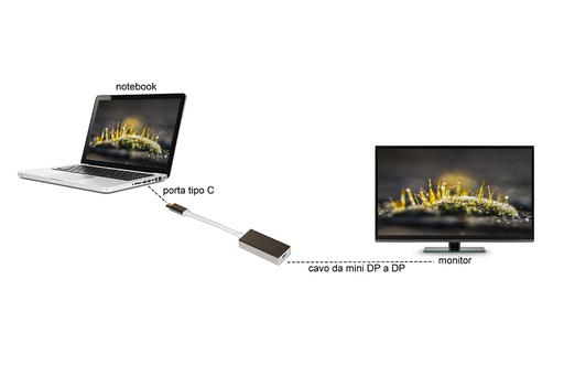 Adattatore USB 3.1 Type C« a Mini Displayport per Macbook, Ultrabook, Notebook, Laptop o PC. Connette i dispositivi con porta USB-C a una porta DP di un monitor o proiettore. In pratica avendo un dispositivo con porta USB-C si pu= collegare un monitor o TV DVI con un cavo Mini DP. Risoluzione 4K 60Hz Connettori: Mini DP Femmina e USB Type C Maschio. Dalla versione Android 12 in poi, l'adattatore Þ utilizzabile solo in smartphone con MHL attivo. Pu= essere necessario disattivare la funzione Samsung DEX.