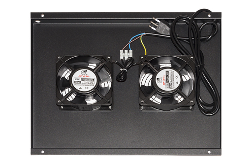 SISTEMA DI VENTILAZIONE PER RACK 19" CON TERMOSTATO Raffreddano in maniera efficiente l'interno dell'armadio evitando il surriscaldamento dei dispositivi contenuti nell'armadio e quindi preservandoli da usura. Con 2 ventole 220 volt 120x120x38mm. con griglia di protezione. Si installano a soffitto dei mobili rack marchio Link profondi 600 mm. Colore nero (RAL9005). Con cavo di alimentazione mt. 1,80 spina tripolare italiana 10A. Le viti di fissaggio sono incluse. Misure 41X35 cm.