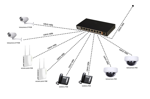 Switch di rete Power over Ethernet (PoE), economico e rapido su reti delle piccole e medie imprese Questo switch PoE con 8+1 porte 10/100Mbps con alimentatore esterno da 48V/2A, fornisce un modo semplice di installare dispositivi PoE (telecamere IP, Access point wireless, ecc.). E pu= identificare i dispositivi PoE conformemente allo standard PoE. Cosż gli utenti non si devono preoccupare che il PoE danneggi i loro dispositivi. La distanza massima di trasmissione POE Ž di 250 metri con cavo Cat 5e. Idealmente, diminuendo la lunghezza del cavo si reduce la degradazione del segnale lungo il cavo: anche lĘuso di cavi di alta qualitÓ in rame pu= ridurre la perdita di segnale allĘaumentare della distanza. Grazie al supporto PoE, tutto ci= che serve Ž un unico cavo di rete per lĘalimentazione e il trasferimento dei dati. Installazione Plug & play, non cĘŽ bisogno di fare configurazioni, quindi Ž piuttosto semplice installarlo. Caratteristiche principali: Con 9 porte RJ45 10/100 Mbps con Auto-Negoziazione di cui 8 porte PoE, la nona porta Ž una porta 100Mbps uplink. Conforme allo standard IEEE802.3af. Ogni porta supporta auto-negoziazione 10/20, 100/200Mbps (Fast Ethernet). Larghezza banda 1.8Gbps. Supporto Vlan. Potenza massima per singola porta PoE Ž 15.4W. Budget totale 96 watt Supporta automaticamente la funzione di identificazione per proteggere il Sistema quando cĘŽ un sovraccarico o quando non Ž collegato un dispositivo PoE. Indicatori LED per controllare la Potenza, link, attivitÓ e velocitÓ. Con adattatore di alimentazione 48V/2A 12(+) 36(-) Supporta flow control IEEE802.3ax per Full Duplex e back-pressure per modalitÓ Half Duplex. Specifiche tecniche: Standard & Protocolli IEEE802.3, 802.3u, 802.3af, 802.3x CSMA/CD, TCP/IP Funzioni di baseAuto-Learning and Auto-aging MAC Address Flow control IEEE802.3x per modalitÓ Full-Duplex Mode e back-pressure per Half-Duplex Mode Alimentatore 100-240 V AC, 50/60 Hz, with 48V/2A ModalitÓ trasferimentoStore-and-Forward Interfaccia: 8 porte PoE 10/100Mbps RJ45.porta 1-porta 8.e 1 porta 10/100Mbps Non-POE RJ45.porta 9.
