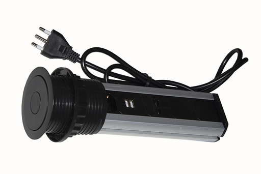 Multipresa a scomparsa, per montaggio su tavolo o su un ripiano. Si pu= estrarre e riporre nel suo alloggiamento, evitando quindi di occupare spazio sul tavolo, e dando la comoditÓ di avere delle prese a disposizione sul tavolo. Ideale per uffici, o dove si debbano collegare e scollegare cavi di alimentazione rapidamente. Quando si estrae rimane fissa nella sua posizione, per riporla basta una semplice pressione. Con: 2 prese universali Schuko/Italiane 10-16A tripolari. 1 presa RJ45 8 poli per rete 1 presa RJ11 6 poli 2 prese USB per alimentazione 5V 2A Lunghezza cavo Mt. 1,70, con spina tripolare italiana 16A. Diametro multipresa 8 cm, altezza cm 29 Per l'installazione Ž necessario praticare un foro sul pianale del diametro di 8 cm, se non giÓ presente.