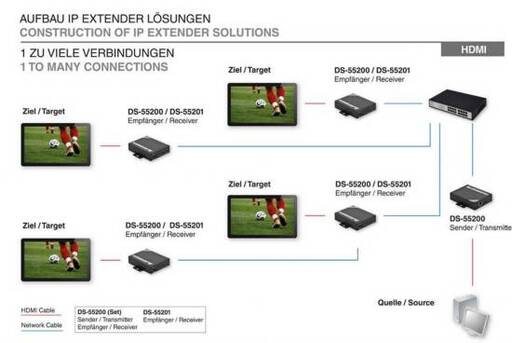 Consente una distribuzione semplice e veloce del segnale video HDMI. In questo modo potrete posizionare lo schermo in qualsiasi luogo Estensore HDMI, unitÓ di ricezione, collegamento tramite cavo di rete in rame CAT. 5e/6, fino a 100 m, configurabile a cascata Montabile su rack L'estensore HDMI over IP (DS-55201) DIGITUS« Ž un'estensione della serie di amplificatori over IP DIGITUS« (DS-53200, DS-55200, DS-56200) per accedere da una sorgente a piØ dispositivi di visualizzazione tramite la rete IP. Ricevitore HDMI Installazione semplice con cavi di rete Cat.5/6 economici Uso della struttura di rete esistente per la trasmissione del segnale Ciascuna coppia (trasmittente e ricevitore) amplifica il segnale fino a 100 m (330 piedi) Supporta 1080p Full HD CompatibilitÓ HDTV (720p, 1080i, 1080p) Supporta stereo 2.0 Ricevitori a cascata con fino a 10 unitÓ Connessione consolle (porta RS-232) per la gestione remota Supporto opzionale per un telecomando a infrarossi (IR) Montabile su rack Dimensioni (L x P x H): 115 x 91x 28 mm Peso: 380 g Temperatura di esercizio: 0 fino a 50 ¦C