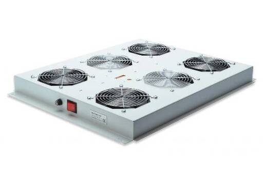 SISTEMA DI VENTILAZIONE PER ARMADIO RACK 19" CON TERMOSTATO. Per armadi linea server. Per installazione a soffitto dei mobili rack profondi 1000 mm. della linea server. Fino a 12,8 metri cubi di circolazione aria al minuto, con termostato per regolare la temperatura di partenza e interruttore di accensione. Certificato CE, DIN EN10130-99 EREGLI DC-01 6112 CRS. Colore Grigio chiaro RAL7035