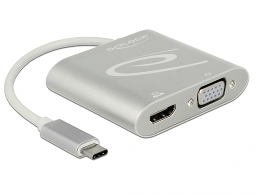This splitter by Delock is suitable for the connection of a VGA monitor and an HDMI monitor to a computer with USB-C interface and DisplayPort alternate mode support. Two monitors can be operated simultaneously at the outputs.