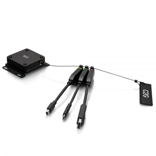 Il supporto retraibile universale per cavi si fissa a qualsiasi superficie piana come un tavolo o un leggio, con una flessibilità di montaggio che permette di trovare la soluzione migliore per ciascun ambiente. Il dispositivo di retrazione estende il cavo fino a 15 m, in modo che gli adattatori siano sempre a portata di mano quando servono. Il dispositivo stesso è stato testato per oltre 20.000 cicli di estensione, per garantire una lunga durata.