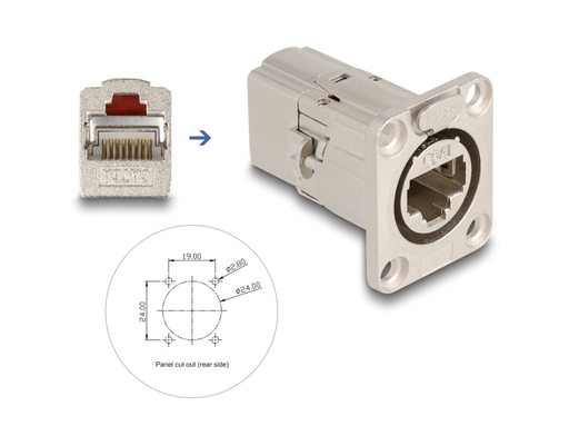 This RJ45 built-in conenctor with D-shaped metal flange by Delock can be used for panel mounting and for installation in a housing.