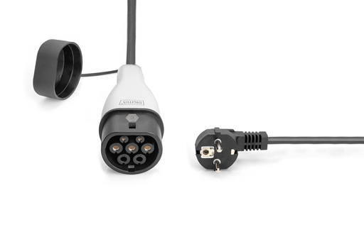 La stazione di ricarica mobile DK-1P16-A-050-BL di DIGITUS offre una soluzione intelligente e conveniente per ricaricare i veicoli elettrici. La spina munita di messa a terra può essere collegata a qualsiasi normale presa da 230 V. La spina del cavo di ricarica è compatibile con tutti i veicoli elettrici e ibridi di tipo 2. Il cavo IP55 ha una lunghezza di 5 m ed è adatto al trasporto in varie località.