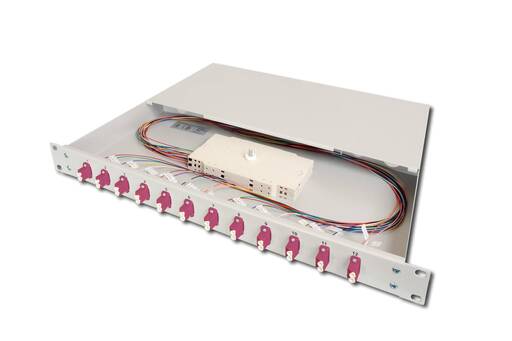 Scatola di giunzione per fibre ottiche, 1U, equipaggiata, 12x LC DX, OM4, incluso cassetta di giunzione, pigtail colorati, giuntiDettagli tecnici Completamente confezionato, spiraline della fibra staccate e presentato nel supporto per i moduli di giunzione Spiraline colorate Giunti con ghiere in zirconio ceramica Giunti nell'alloggiamento di plastica Alloggiamento di supporto in maniera da 1,0 mm, laccata 1 unitÓ (44,45 mm) Larghezza 483 mm (19'') ProfonditÓ 240 mm Sono inclusi passacavo M20/M25, cassetta, coperchio della cassetta e scarico della trazione Estensibile Classe fibra: OM4 Colore: grigio chiaro, RAL 7035 Montaggio: Scatola di giunzione Numero di fibre: 24 Tipo: scorrevole Tipo di connettore: LC/UPC/duplex PANNELLO OTTICO