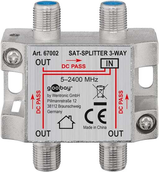 Divisore splitter per TV e Satellite 1 ingresso 3 uscite, può essere utilizzato per dividere il segnale TV oppure Satellite proveniente da antenna o parabola ed inviarlo a 3 prese/utenti.