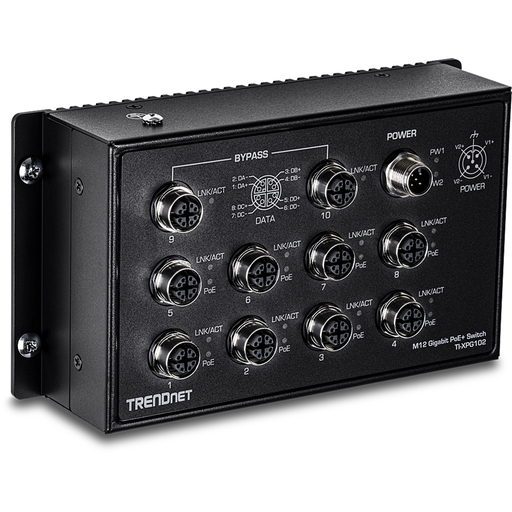 TRENDnet’s 10-Port Industrial EN 50155 M12 Gigabit PoE+ Railway Switch, model TI-XPG102, has eight M12 gigabit PoE+ ports, two M12 gigabit ports, and one M12 power port with a total PoE budget of up to 200W with 56VDC input. This M12 Ethernet switch is equipped with an IP40 rated metal enclosure, designed to withstand a high-degree of vibration and shock, while operating within an extreme temperature range of -40° – 75° C (-40° – 167° F) for industrial EN 50155 applications. The M12 Ethernet switch is designed and tested for bus, train, automobile, and telecom applications.