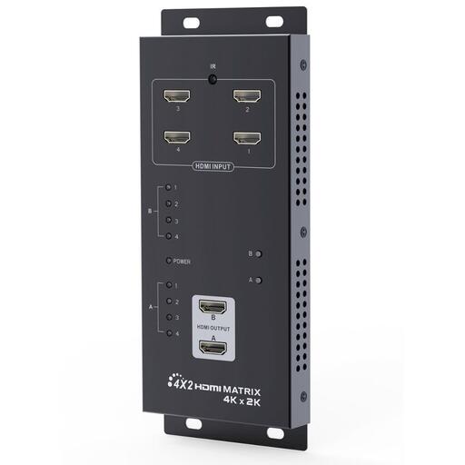 Il matrix IDATA HDMI-MX42 a 4 ingressi e 2 uscite consente di visualizzare una qualsiasi delle quattro sorgenti su uno dei due monitor collegati oppure può lavorare come splitter per mostrare la stessa fonte su 2 display contemporaneamente.