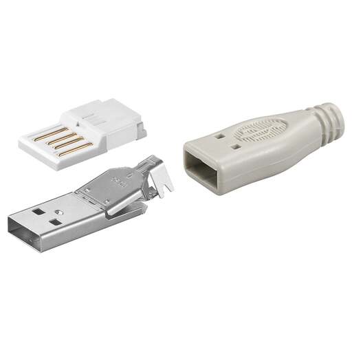 Connettore USB a saldare per un rapido assemblaggio di connettori o cavi patch USB. Il set è composto da 4 parti: inserto di contatto, alloggiamento, pressacavo e manicotto antipiega.