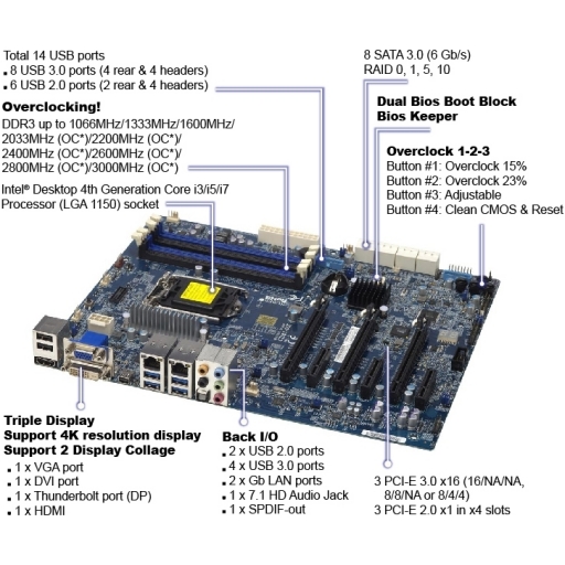 Socket H3 (LGa 1150), Intel Z87 Chipset, 4x DIMM 1600MHz (2133/2200/2400/2600/2800/3000MHz overclocking) DDR3 Non-ECC (32GB max), RealTek ALC1150 HD Audio, RAID 0/1/5/10, 8x SAta III, 3x PCIe x16, 3x PCIe x1, VGA, HDMI, DVI, Thunderbolt, 1x COM, PS/2, 3x RJ-45, 8x USB 3.0, 6x USB 2.0, Audio jacks, ATX, Retail Pack