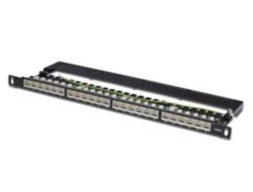 Pannelli patch 24 porta Categoria 6 con dimensioni estremamente ridotte (solo 0,5 HE) occupa solo mezza unitÓ nell'armadio, consentendo di risparmiare spazio. Con copertura antipolvere sui connettori RJ45 8 poli. Prestazioni del collegamento Classe E, per un massimo di 250MHz, EN 50173 e ISO/IEC 11801 Schermato Installazione del cavo con strisce LSA, codici colore basico su EIA/TIA 568 A & B PossibilitÓ di fissaggio per fascette, messa a terra centrale Adatto per Montaggio a staffa 483mm (19") 24 porte RJ45 CAT 6 Colore nero RAL9005