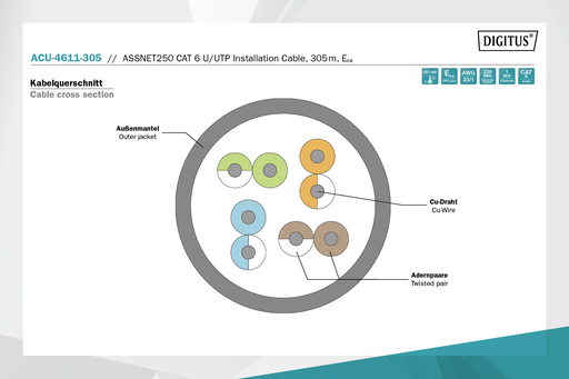 Dettagli tecnici ProprietÓ fisiche: Conduttore: AWG 23/1, rame rivestito di alluminio Isolamento: PE Numero complessivo di conduttori isolati: 8, riuniti in 4 coppie da 2 Codice del colore: blu-bianco, arancione-bianco, verde-bianco, marrone-bianco Schermatura della coppia: nessuna Schermatura totale: nessuna Guaina esterna: PVC Spessore della guaina esterna: 0,55 mm nominale Colore: Grigio (RAL 7035) ProprietÓ meccaniche: Carico di trazione: max. 150N Raggio di curvatura dinamico: 8x AD mm min. Raggio di curvatura statica: 4x AD mm min. Gamma della temperatura di trasporto e di conservazione: da -20 ¦C a +75 ¦C Intervallo di temperatura: da -20 ¦C a +60 ¦C Gamma di temperature per l'installazione: da 0 ¦C a +50 ¦C ProprietÓ elettriche: Impedenza media: 100¦5 Ohm a 1-100 MHz CapacitÓ: 40 pF/m nominal @ 800 Hz Squilibrio della capacitÓ (coppia - terra): 1,5 pF/m max. @ 1 KHz Resistenza all'isolamento: 2 GOhm x km min. Impedenza di guasto: 147 Ohm/km max. (sbilancio resistivo max. 2%) Tensione di funzionamento: 72 Vdc max. Assorbimento di inserzione: 40 dB Ritardo della fase: 535 nS/100 m max. Ritardo di propagazione: 20 nS/100 m max. NVP: 69% Assortimento: Cavo di installazione a doppino intrecciato Categoria: CAT 6 Schermatura: U-UTP, non schermato CPR: Eca Lunghezza: 305 m Colore: grigio Guaina: PVC