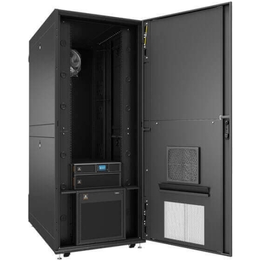 L’unità VRC-S offre una soluzione completa per micro data center che permette di convertire rapidamente le aree non condizionate in uno spazio IT edge preconfigurato per le infrastrutture IT critiche. L’unità è completamente assemblata in fabbrica. Questa soluzione è costituita da un cabinet basato sul rack VR3350 (42U, 1200 mm di profondità, 800 mm di larghezza) con un modulo di raffreddamento split da 3,5 kW preinstallato e pre-caricato (VRC202KIT) che fornisce aria fredda direttamente all’attrezzatura IT critica. L’unità VRCS3350-230VSU comprende un’unità con condensatore esterno per una temperatura ambiente minima fino a -15 °C. Il calore rimosso viene convogliato fuori dalla struttura dell’edificio. Il collegamento dei due elementi di raffreddamento non è incluso. Il sistema rack separa l’aria fredda nella parte anteriore dall’aria calda di scarico nella parte posteriore. Il sistema di raffreddamento è supportato da un ventilatore di emergenza a controllo indipendente. L’unità Vertiv VRC-S è inoltre dotata di una Vertiv Geist rPDU monofase intelligente GU30017L (spegnibile da remoto e monitorata a livello di singola uscita), 32 A, 230 V, montata in verticale con blocco IEC60320 C13 (20) e C19 (4), sensore di temperatura rack (1), cavo di alimentazione esterno da 2,5 m e spina IEC60309 2P + E 32 A. La PDU è collegata ai sensori di temperatura e di contatto della porta. Per una protezione dalle interruzioni di corrente e un condizionamento continuo, in questo micro data center è installato un UPS Liebert® GXT5 da 6 kVA monofase online a doppia conversione con scheda di rete. L’intero sistema può essere gestito tramite un unico indirizzo IP con Vertiv Intelligence Director. La soluzione VRC-S ha garanzia standard di 3 anni. Vertiv offre servizi opzionali di installazione e manutenzione preventiva. Ideale per armadi IT, sale computer di piccole dimensioni e spazi edge computing.