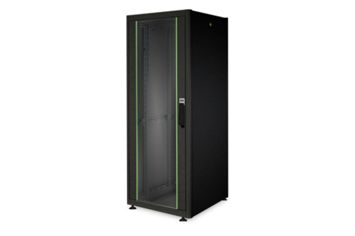 Armadi rack per reti Digitus, specifici per alloggiare componenti attivi e passivi per reti 19". Gli armadi sono in lamiera d'acciaio da 1,5 mm con una forte capacitÓ di carico, verniciata a polvere. Armadi di categoria IP 20 Porta frontale in vetro di sicurezza in struttura di acciaio con chiusura a chiave con serratura a maniglia. La porta Ž reversibile, in modo da poter avere l'apertura a destra o a sinistra a seconda della convenienza. Porta posteriore in metallo pieno con serratura. Sezioni laterali removibili con chiusura a chiave. 4 Montanti da 19" anteriori e posteriori regolabili. In ogni montante l'unitÓ Ž numerata, per semplificare il montaggio dei componenti o la progettazione. PossibilitÓ di ingresso dei cavi di rete dal mezzo della parte inferiore, e dall'alto dell'armadio. Piedini di livellamento, regolabili in altezza. Incluso i kit di viti per il montaggio e messa a terra. Tetto predisposto per unitÓ di ventilazione. Conforme alle norme internazionali IEC 297-2, DIN 41494/Part 7, DIN 41491/Part 1, EN 60950, VDE 0100. Ampia gamma di accessori disponibili. Colore: NERO, RAL9005. CapacitÓ di carico: 600 kg. UnitÓ: 32.